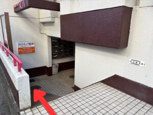 ①建物入口にスロープがついていますので、こちらを使って自転車を駐輪場まで運んでください。