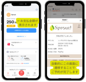 PayPay決済後、決済画面から自動的に予約ページに戻る事で予約が完了します。